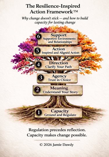 The Resilience-Inspired Action Framework™ is a developmental, capacity-first model used by individuals, clinicians, organizations and public systems to enhance resilience and build change that actually lasts.