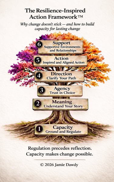 My work is grounded in the Resilience-Inspired Action Framework™, a model designed to strengthen the psychological and relational foundations that make healthy, enduring change possible